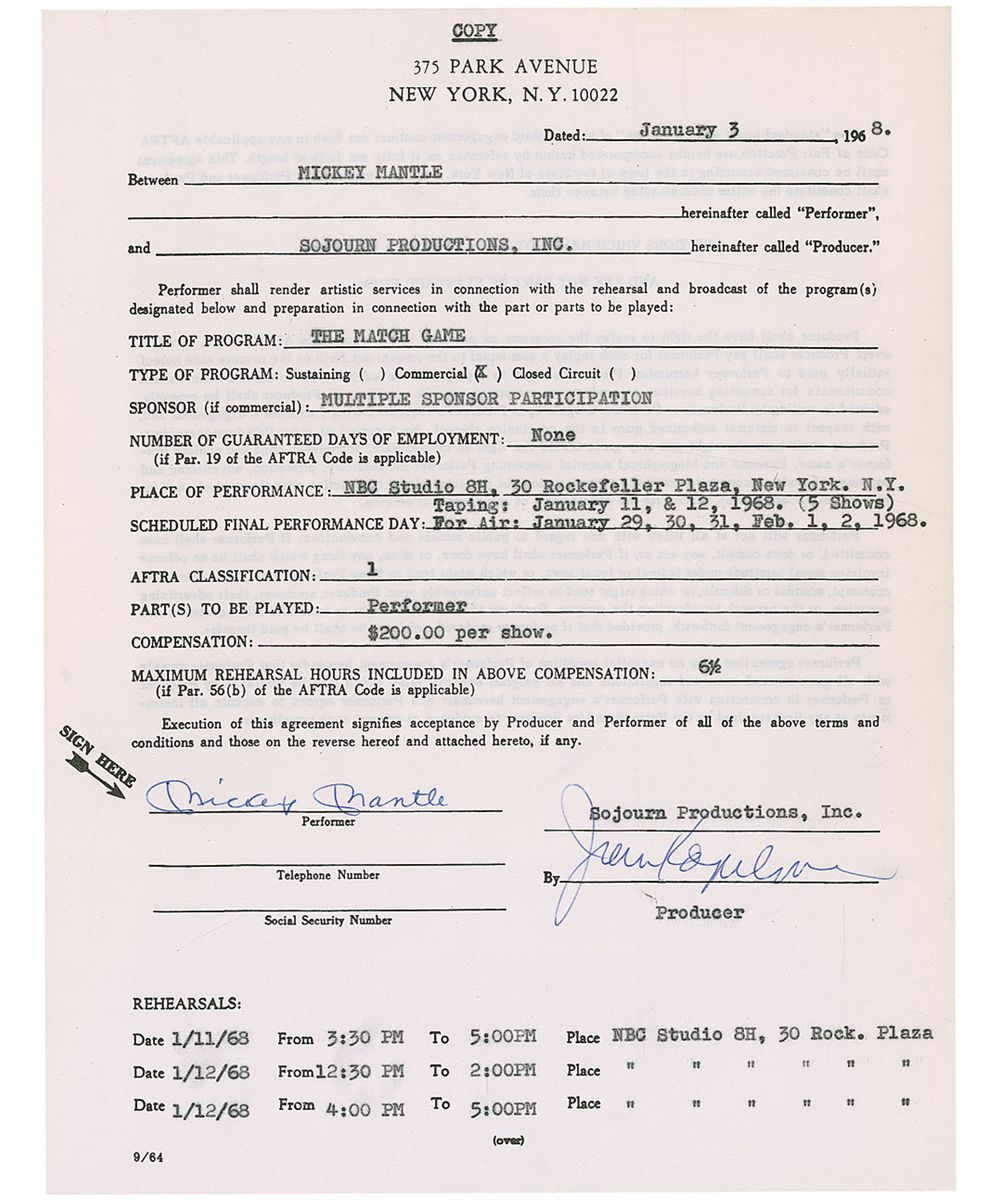 DS, one page both sides, 8.5 x 11, January 3, 1968. Agreement between Mantle and Sojourn Productions for Mantle to appear on five shows of The Match Game on NBC, for a salary of $200.00 per show. Signed at the bottom by Mantle. In fine condition, with a horizontal fold through Mantle’s signature, and a few creases.