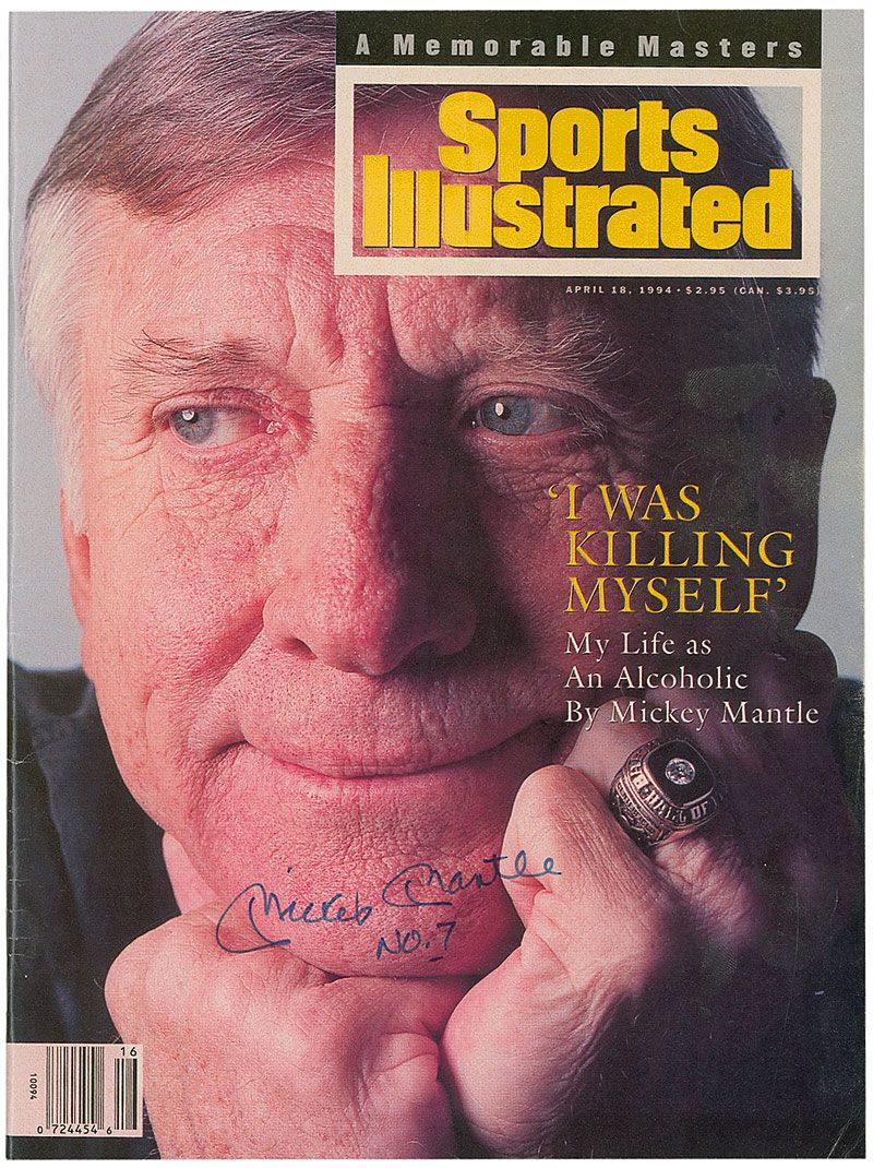 Sports Illustrated magazine, dated April 18, 1994, featuring a cover story on Mantle’s alcoholism, signed on the front cover in blue felt tip, “Mickey Mantle, No. 7.” In fine condition, with some mild handling wear.