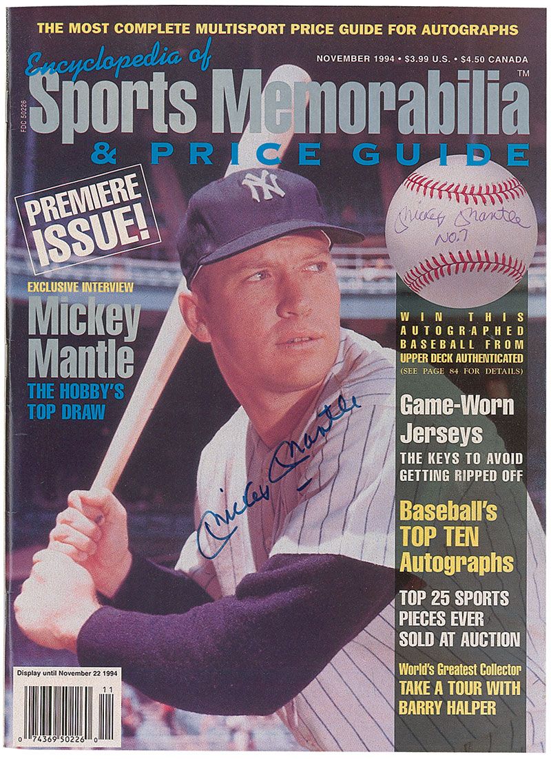 Premier issue of the Encyclopedia of Sports Memorabilia and Price Guide, dated November 1994, featuring Mantle on the cover, signed on the front cover in blue felt tip. In fine condition.