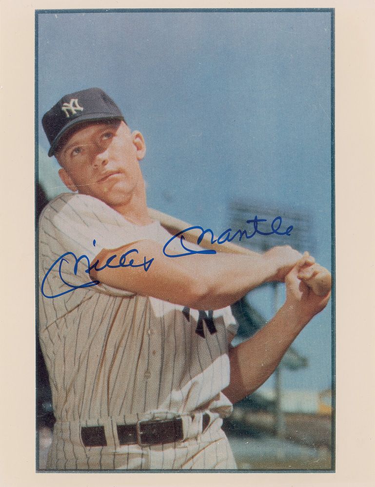 Color satin-finish 8 x 10.25 photo of Mantle’s 1953 Bowman baseball card, signed in blue felt tip. In fine condition.