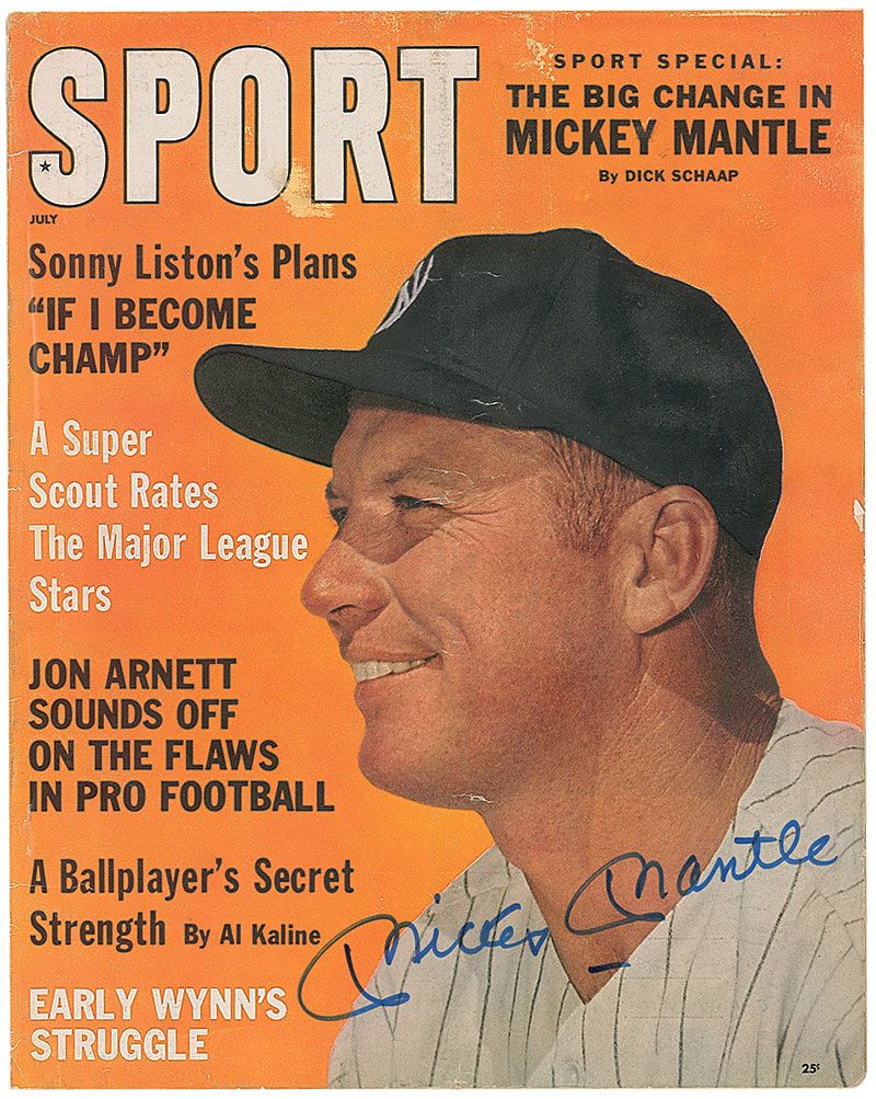 Sport magazine, dated July 1962, featuring Mantle on the cover, signed on the front cover in blue felt tip. Mild handling wear, a bit of light toning and foxing, and some surface rubbing along top of cover, otherwise fine condition. Accompanied by a full