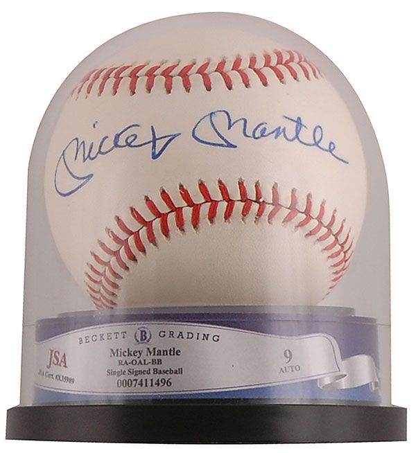 Official Rawlings American League baseball signed in blue ballpoint on the sweet spot. Ball is housed in a plastic James Spence/Beckett authentication holder, grading the autograph a “9.” In very fine condition.