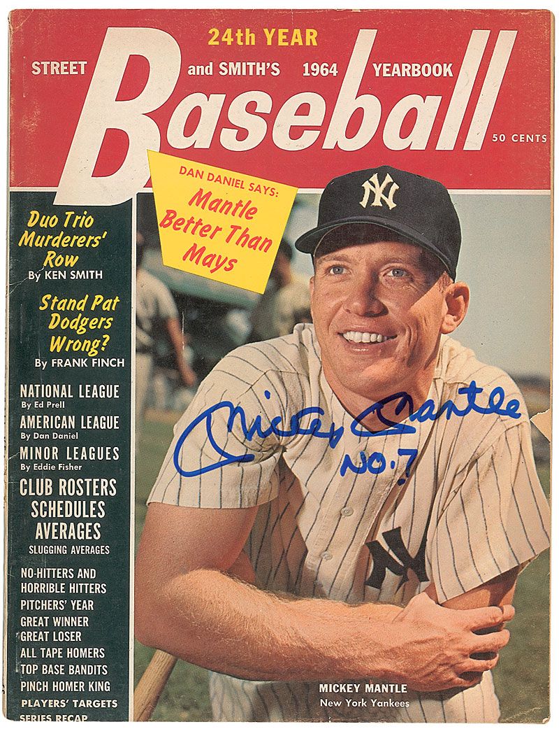 Street and Smith’s 1964 Baseball Yearbook magazine, 8.25 x 11, 128 pages, signed on the front cover in blue felt tip, “Mickey Mantle, No. 7.” A few unobtrusive creases to cover and light general wear, otherwise fine condition.