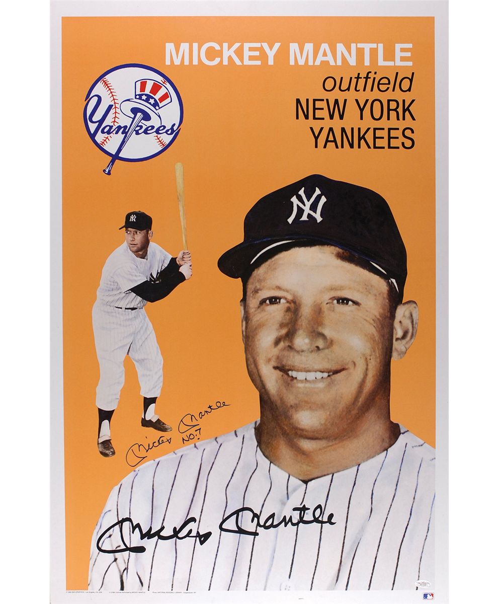 Color 24 x 36 composite print of Mantle in his Yankee pinstripes, signed in blue felt tip, “Mickey Mantle No. 7.” In fine condition.