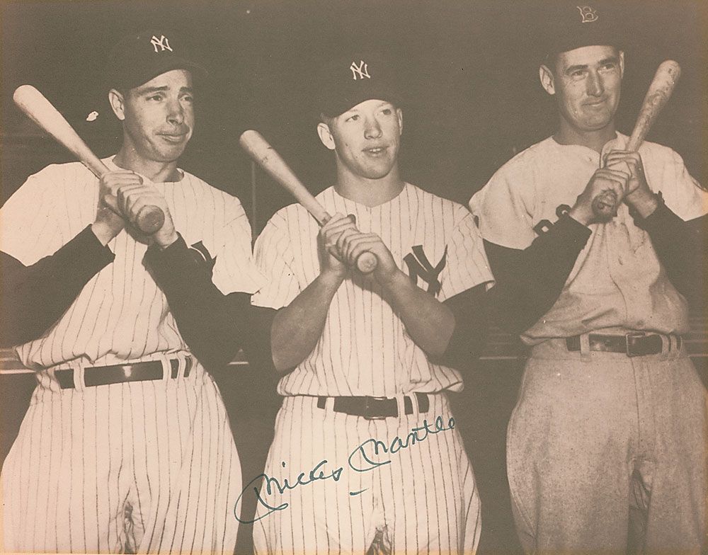Classic 14 x 11 cardstock photo of Mantle with Joe DiMaggio and Ted Williams, signed in blue felt tip by Mantle. In fine condition, with light toning to edges.