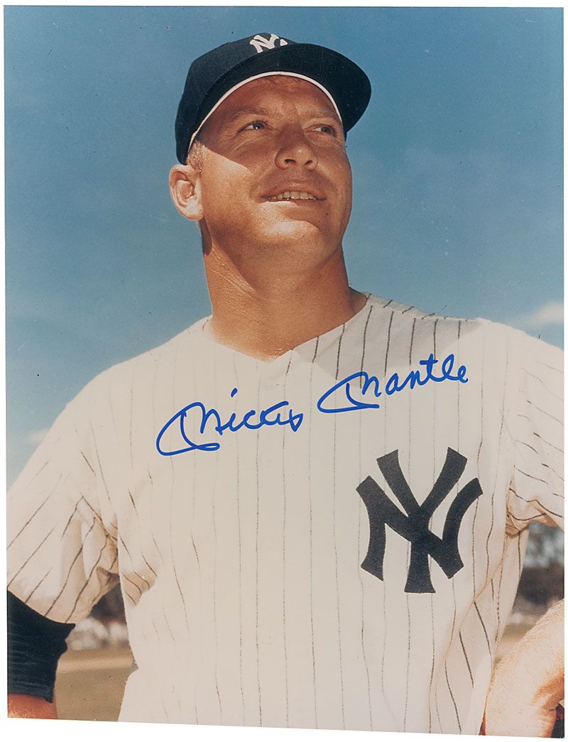 Color satin-finish 7.5 x 9.75 photo of Mantle in his Yankee pinstripes, signed in blue felt tip. In fine condition, with slightly trimmed edges.