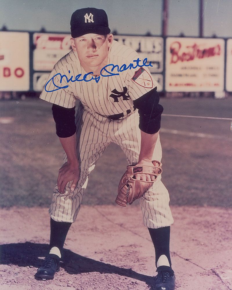 Color glossy 8 x 10 photo of Mantle from his rookie year with the New York Yankees, signed in blue felt tip. In fine condition.