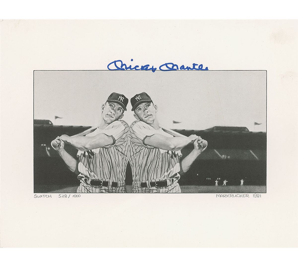 Attractive limited edition print entitled ‘Switch,’ numbered 528/1000, 11 x 8.5, signed at the top in blue felt tip by Mantle. Also signed in the lower left in pencil by the artist, “Mark Rucker, 1981.” In fine condition, with a few fingerprints to borders and a ding to one corner tip.