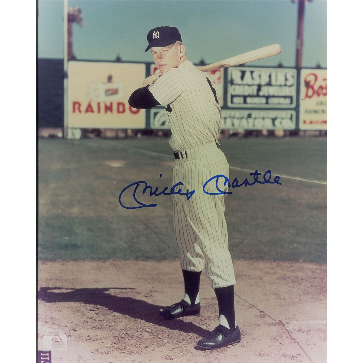 Color glossy 8 x 10 photo of Mantle posing in his batting stance, signed in blue felt tip. In fine condition.