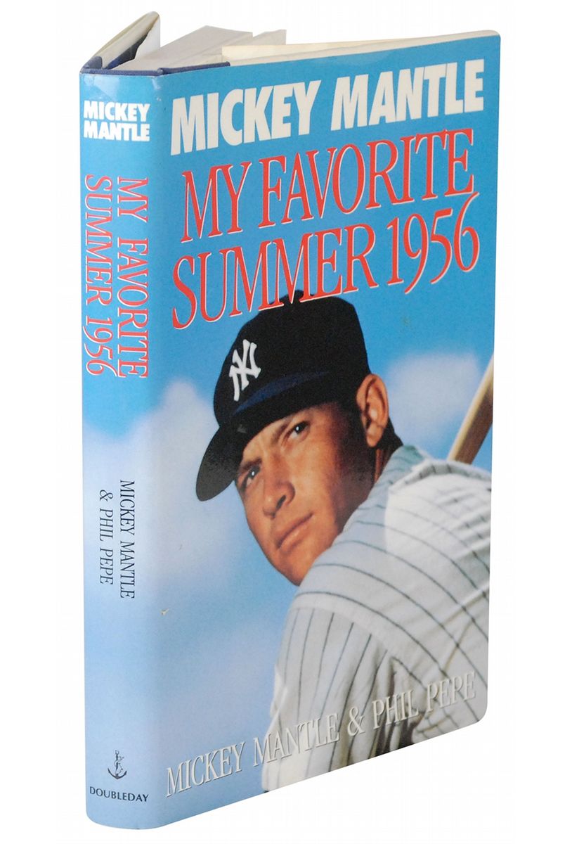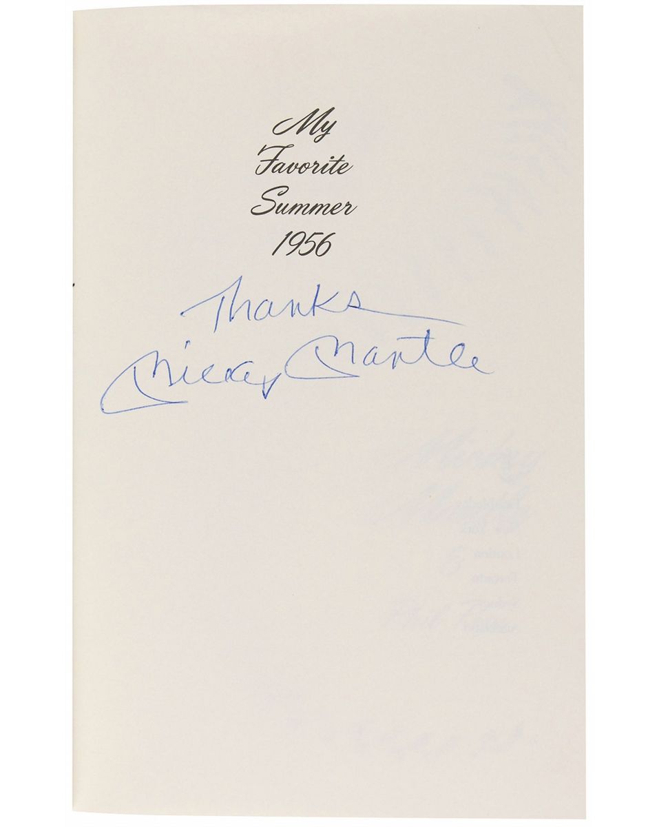 Signed book: My Favorite Summer. First edition, first printing. NY: Doubleday, 1991. Hardcover with dust jacket, 6.5 x 9.5, 246 pages. Signed on the half-title page in blue ballpoint, “Thanks, Mickey Mantle.” In fine condition, with a couple trivial creases to the inside flap of the dust jacket.