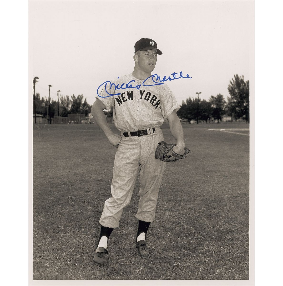 Glossy 8 x 10 photo of a young Mantle in his Yankees uniform, boldly signed in blue felt tip. In very fine condition. From the collection of noted publisher and founder of Lord John Press, Herb Yellin.