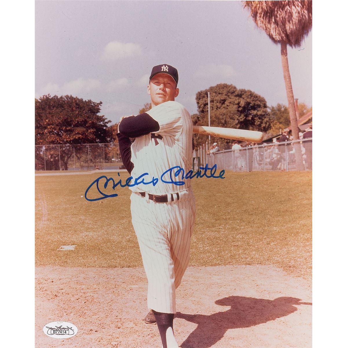 Color glossy 8 x 10 photo of Mantle finishing his swing, signed in blue felt tip. In fine condition, with a James Spence authentication label affixed to lower left corner and a trivial, toned crease to left edge.