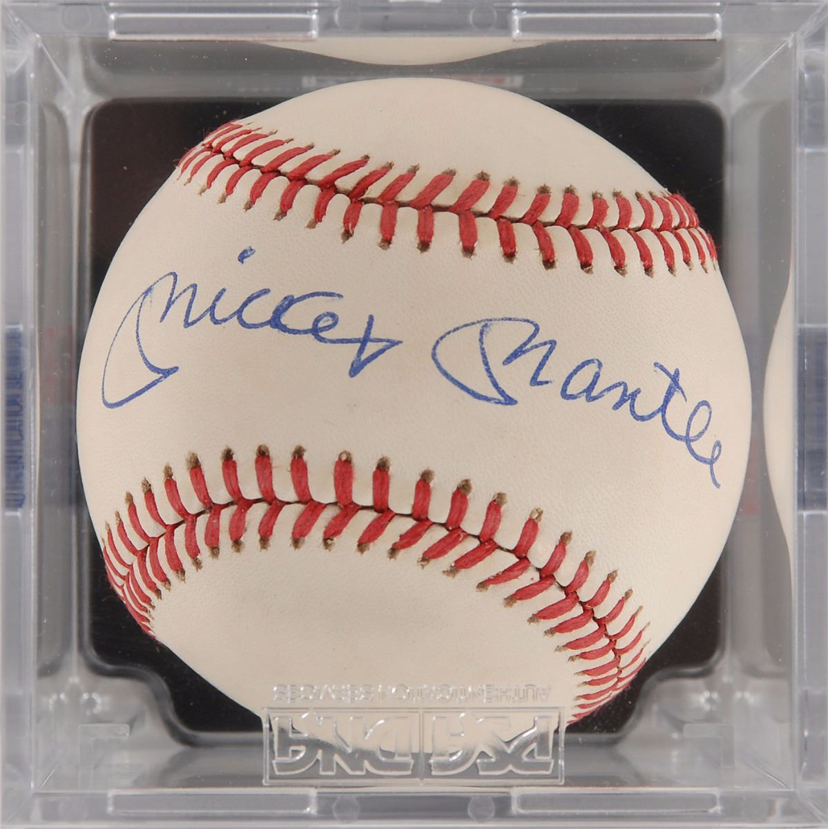 Official Rawlings American League (Brown) baseball signed in blue ballpoint on the sweet spot. In fine condition. Graded an ‘8.5’ overall by PSA/DNA with a signature grade of ‘Mint 9,’ and encased in a ball cube with a full letter of authenticity from PSA/DNA.
