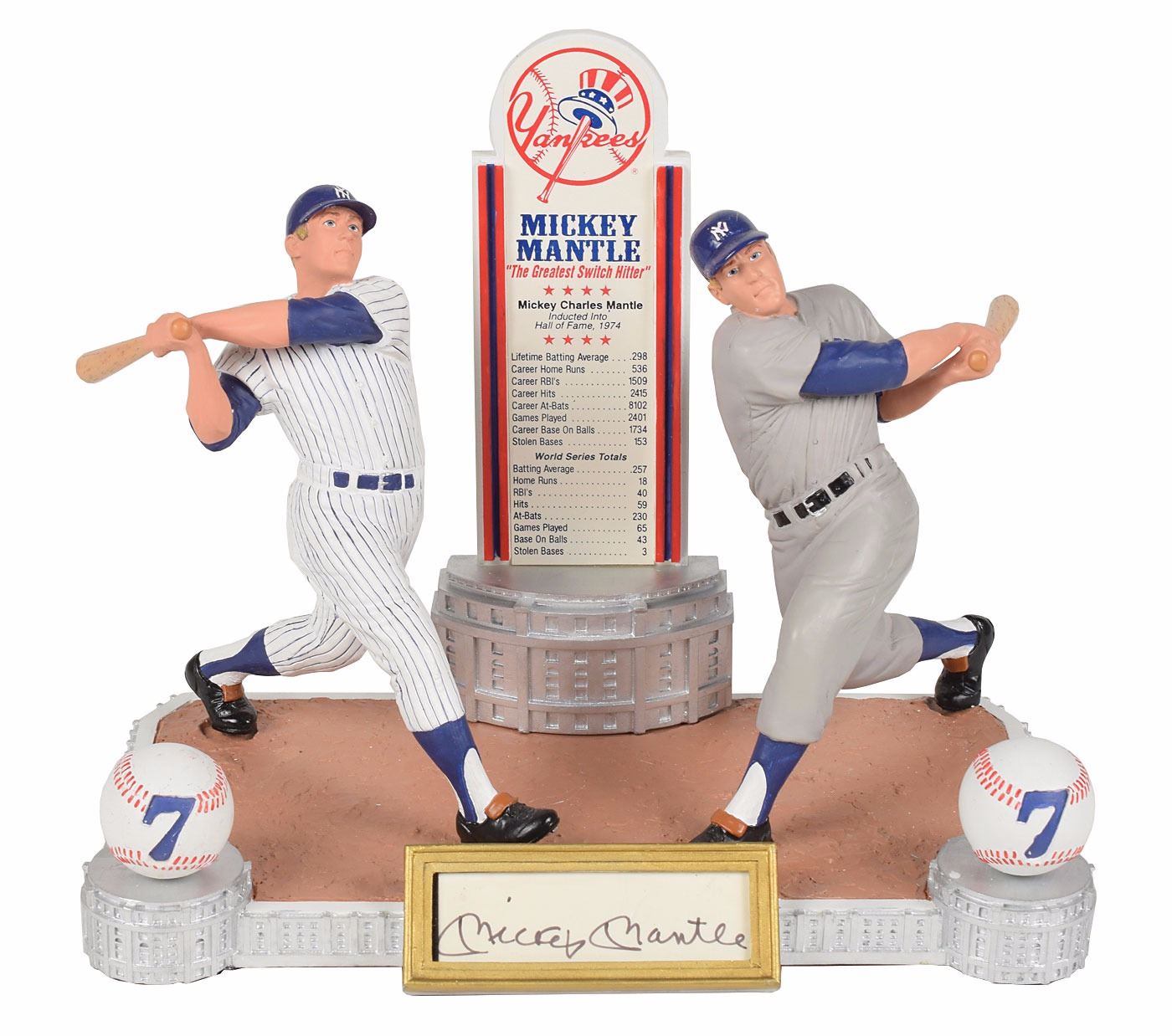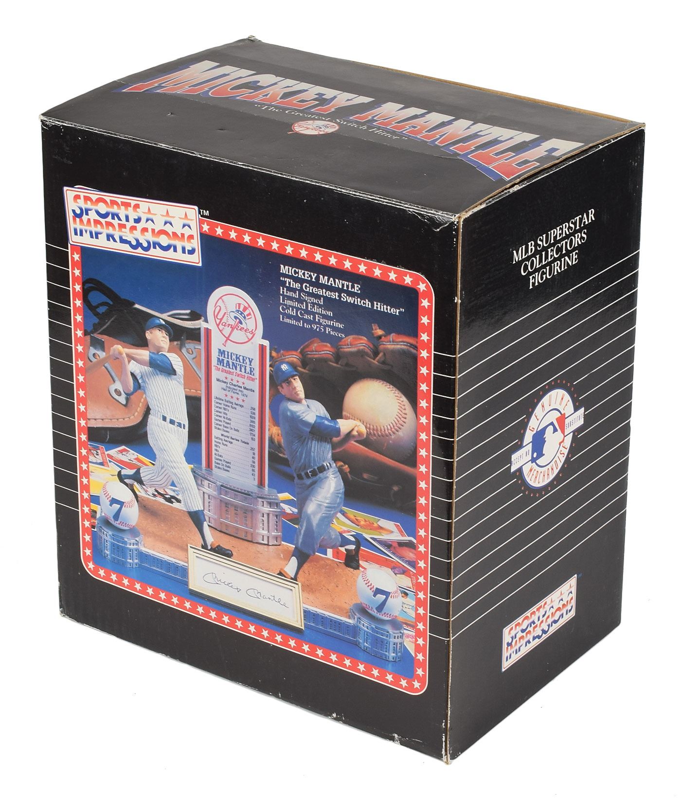 Limited edition Mickey Mantle figurine by Sports Impressions, numbered 968/975, measuring approximately 9 x 7.5 x 5, portraying the great switch-hitter in both his home and road New York Yankees uniforms, signed on a plate on the base in black felt tip, "Mickey Mantle." In fine condition. Accompanied by the Sports Impressions certificate of authenticity and original box.