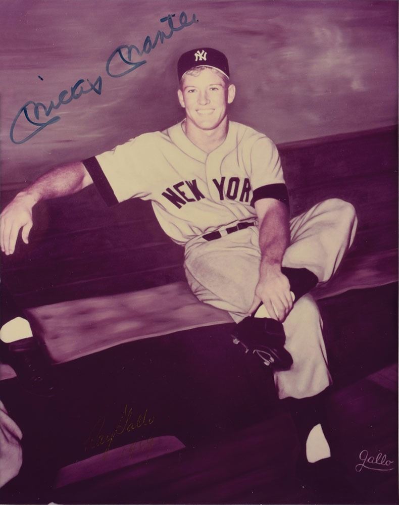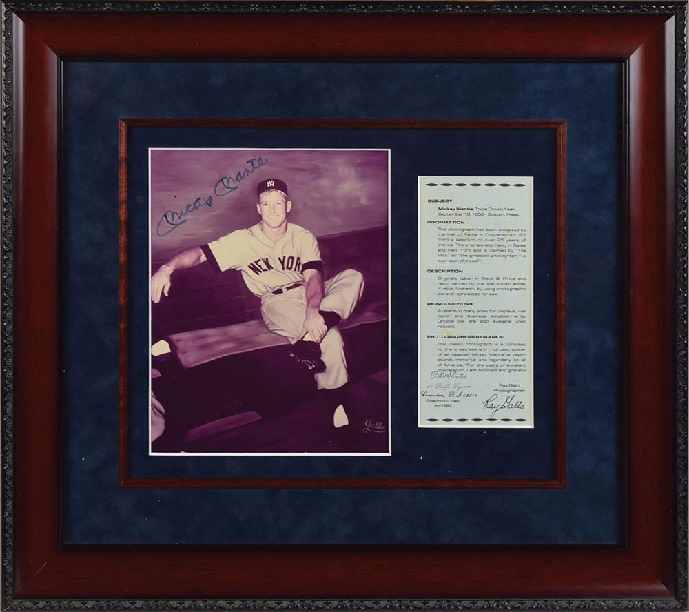 Color semi-glossy 7.5 x 9.5 photo of Mantle posing on a bench, signed in black felt tip. The photo is also signed in gold ink by the original photographer, Ray Gallo, who adds "1989." Double-cloth-matted and framed with an information sheet for the Gallo photograph to an overall size of 21.5 x 19. In fine condition.