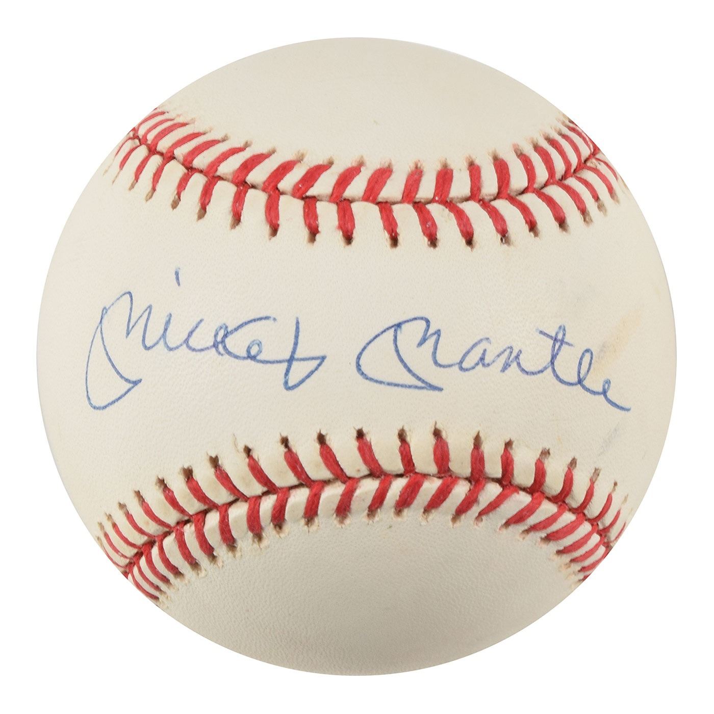 Official Rawlings American League (Brown) baseball signed in blue ballpoint on the sweet spot by Mickey Mantle. In fine condition, with a touch of soiling at the end of Mantle's signature, and a JSA authentication label affixed near the league stamp.
