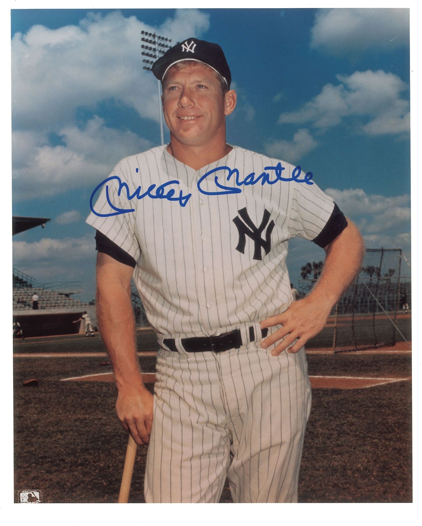 Color glossy 8 x 10 photo of Mantle posing in his New York Yankees pinstripes, signed in blue felt tip. In fine condition.