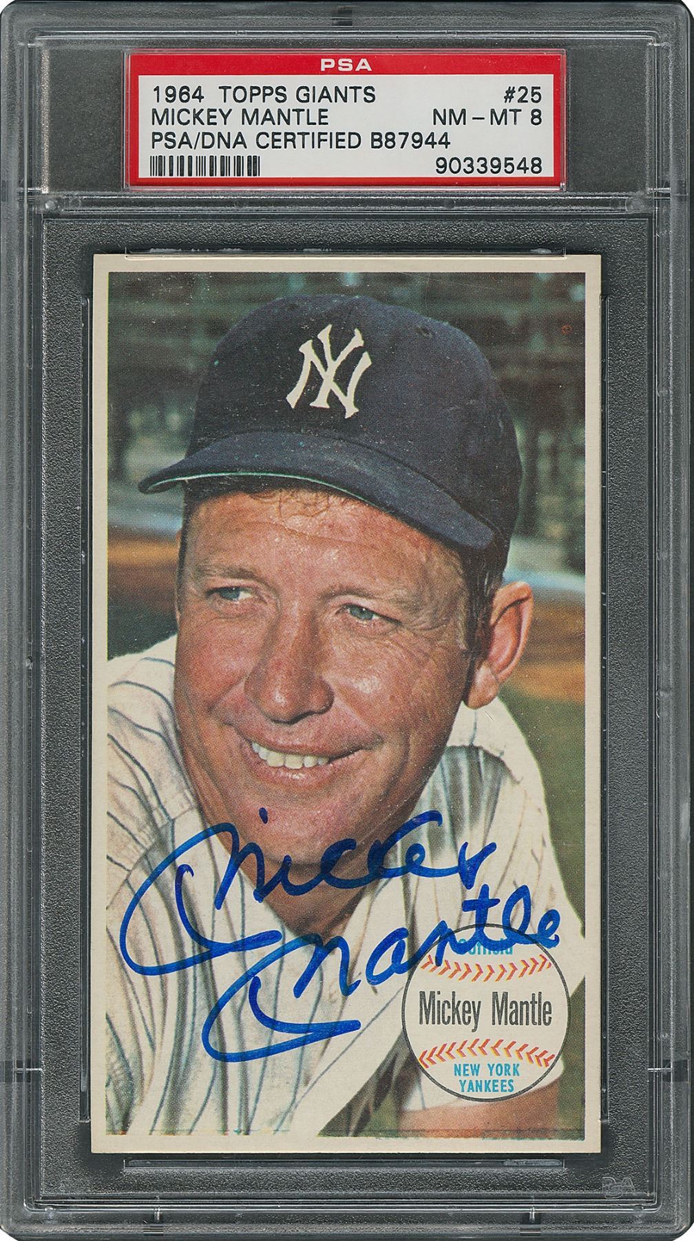 1964 Topps Giants #25 Mickey Mantle baseball card featuring a close-up portrait of the New York Yankees icon, signed in blue felt tip. Encapsulated and graded by PSA as NM-MT 8.