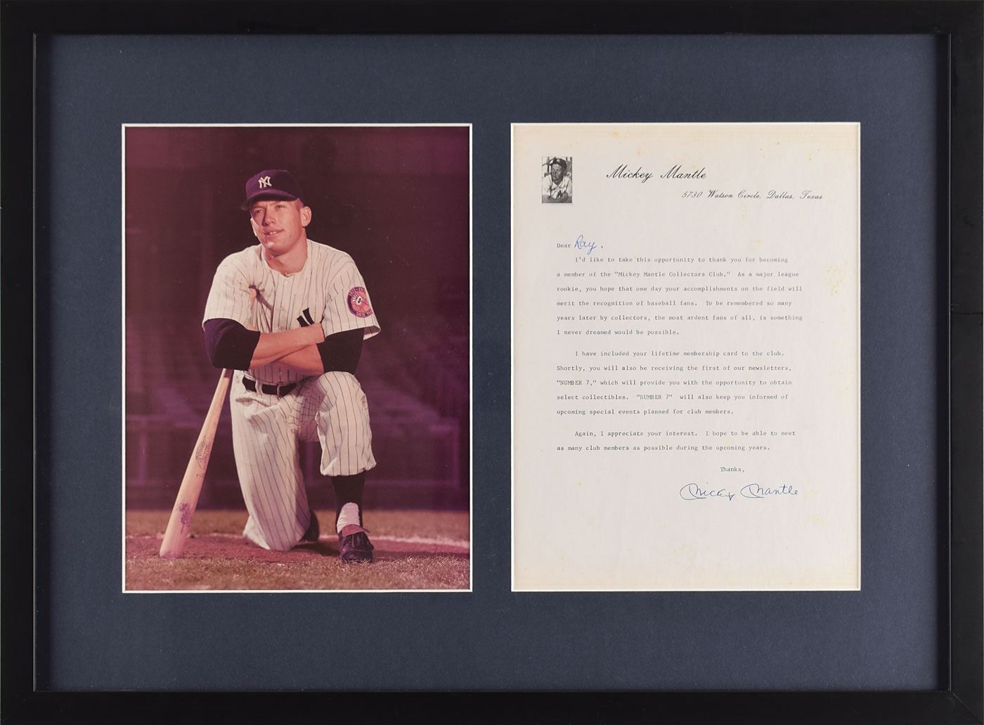 Printed form letter signed in ballpoint, "Mickey Mantle," one page, 8.5 x 11, personal letterhead, no date. Letter to "Ray," in part: "I'd like to take this opportunity to thank you for becoming a member of the 'Mickey Mantle Collectors Club.' As a major league rookie, you hope that one day your accomplishments on the field will merit the recognition of baseball fans. To be remembered so many years later by collectors, the most ardent fans of all, is something I never dreamed would be possible." Matted and framed with a portrait to an overall size of 22.75 x 16.75. In fine condition, with a bit of light toning to the top, and light creasing to the photo. Accompanied by a full letter of authenticity from PSA/DNA.