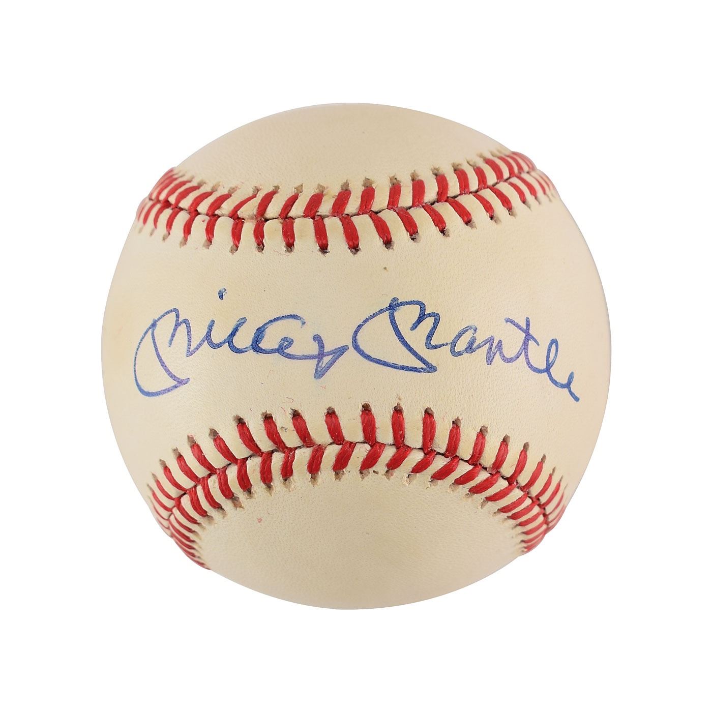 Official Rawlings American League (Brown) baseball signed neatly on the sweet spot in black ballpoint by Mickey Mantle. In fine condition.