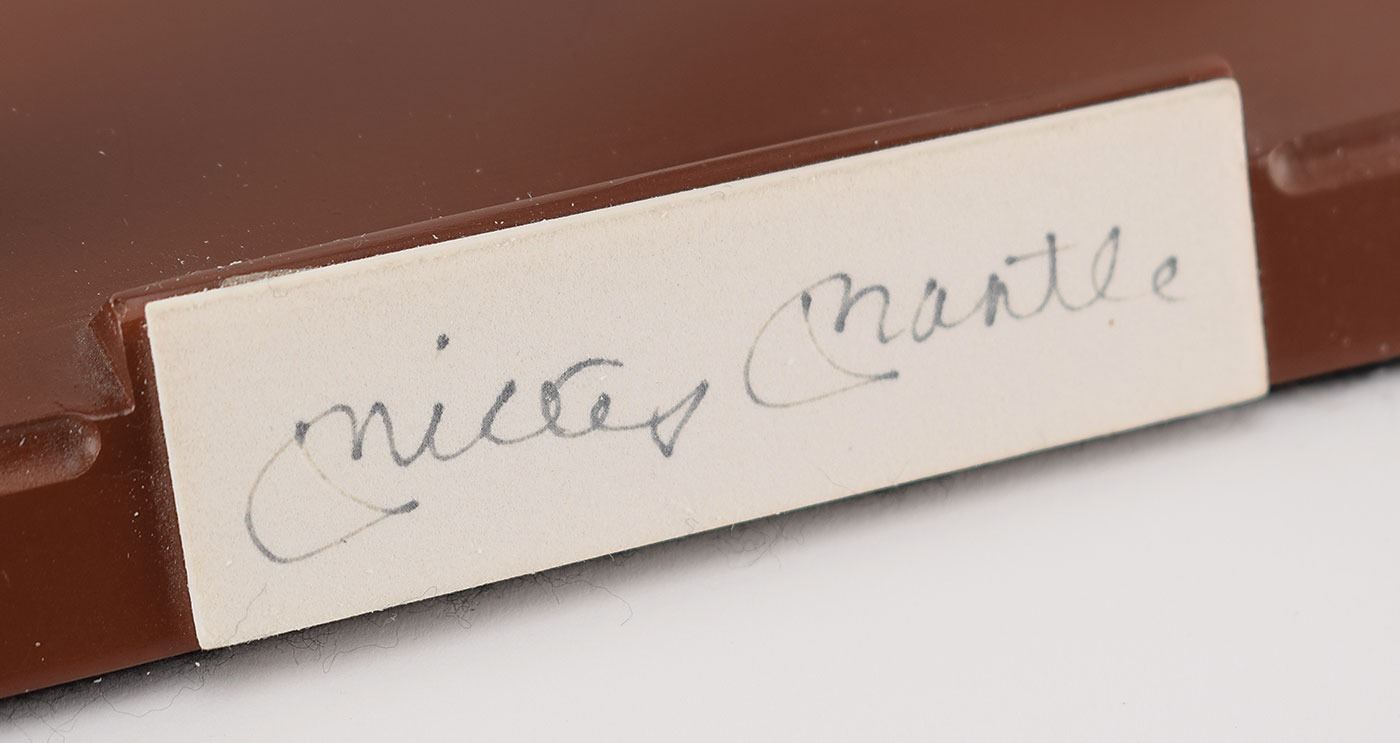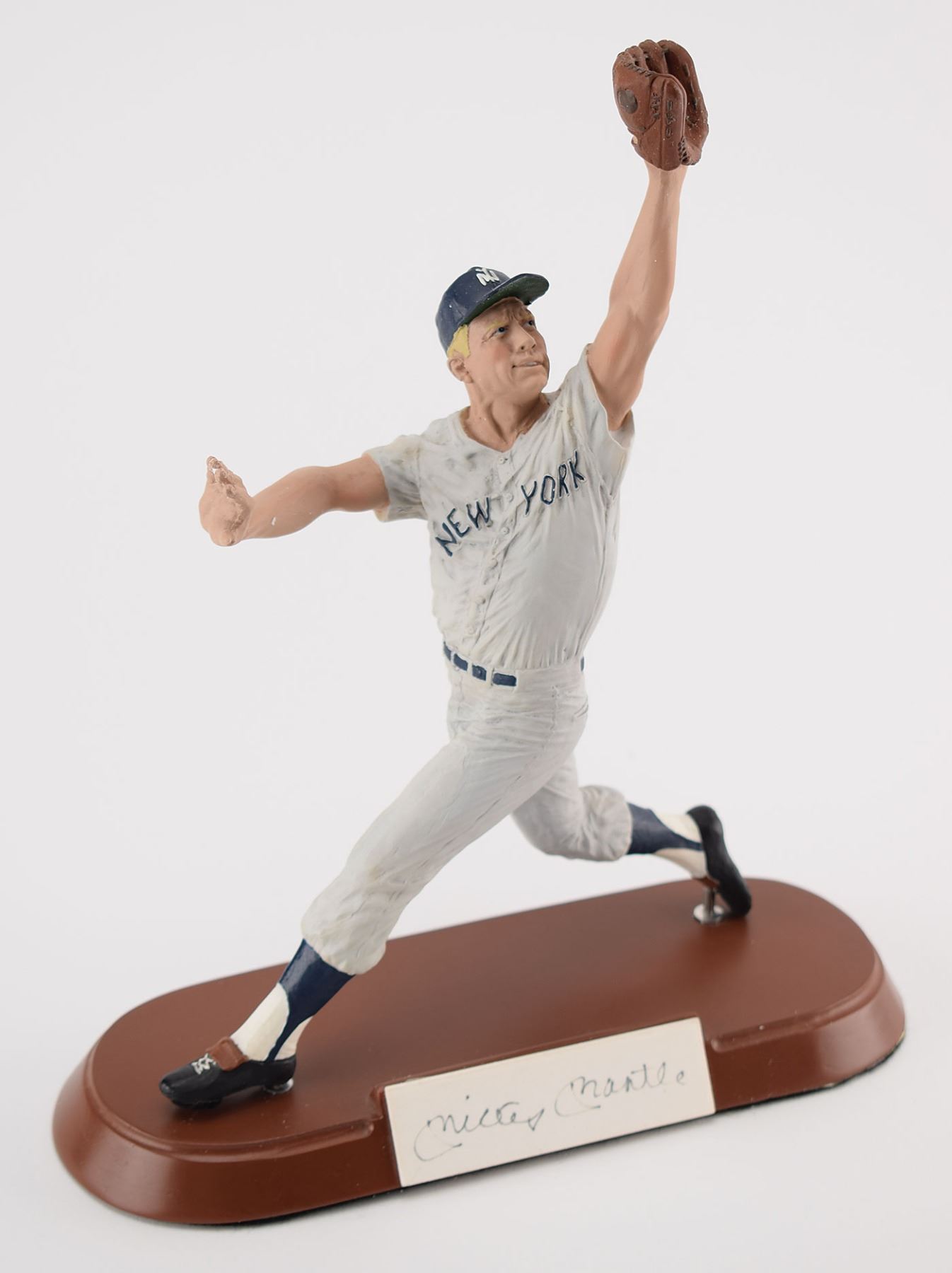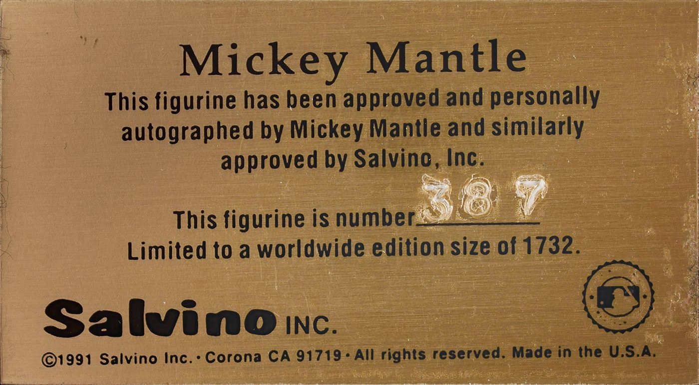 Limited edition cold-cast porcelain Salvino figurine of Mickey Mantle fielding, numbered 387/1732, signed on the white plate on the base in black felt tip by Mantle. In fine condition. Accompanied by the original box and a certificate of authenticity from Salvino.