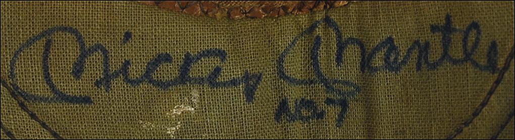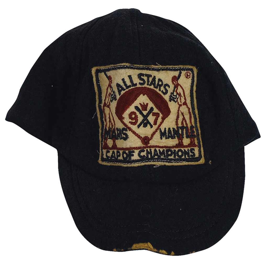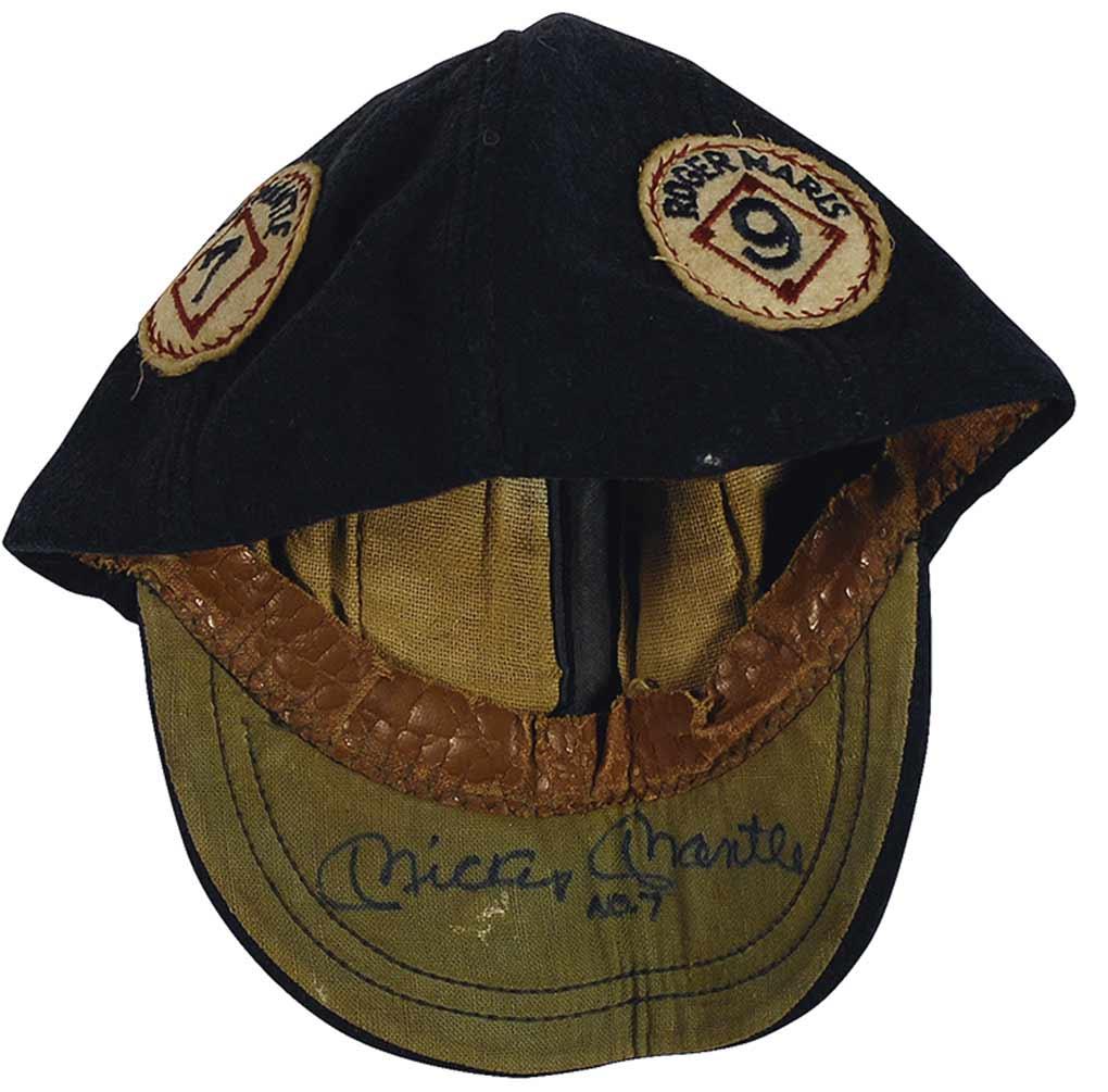 Child-size Maris and Mantle Cap of Champions baseball cap signed in blue felt tip under the brim, “Mickey Mantle No. 7.” Consignor notes that he acquired the signature when serving as a bat boy. In fine condition, with vertical crease to brim, affecting small portion of signature, and moderate age wear.