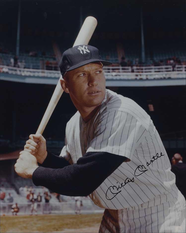 Color satin-finish 16 x 20 photo of Mantle in his batting stance at Yankee Stadium, signed in black felt tip. In fine condition. Pre-certified Steve Grad/PSA/DNA and RRAuction COA.