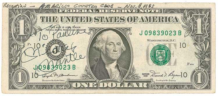 Series 1981 one dollar bill, signed and inscribed on the portrait side in black ink, “To Pauline, Mickey Mantle.” Collector’s notation along top edge reads, “Reception—Amarillo Country Club—Nov 8, 1983.” In fine condition, with expected wrinkling, and light contrast to portion of signature. Pre-certified Steve Grad/PSA/DNA and RRAuction COA.