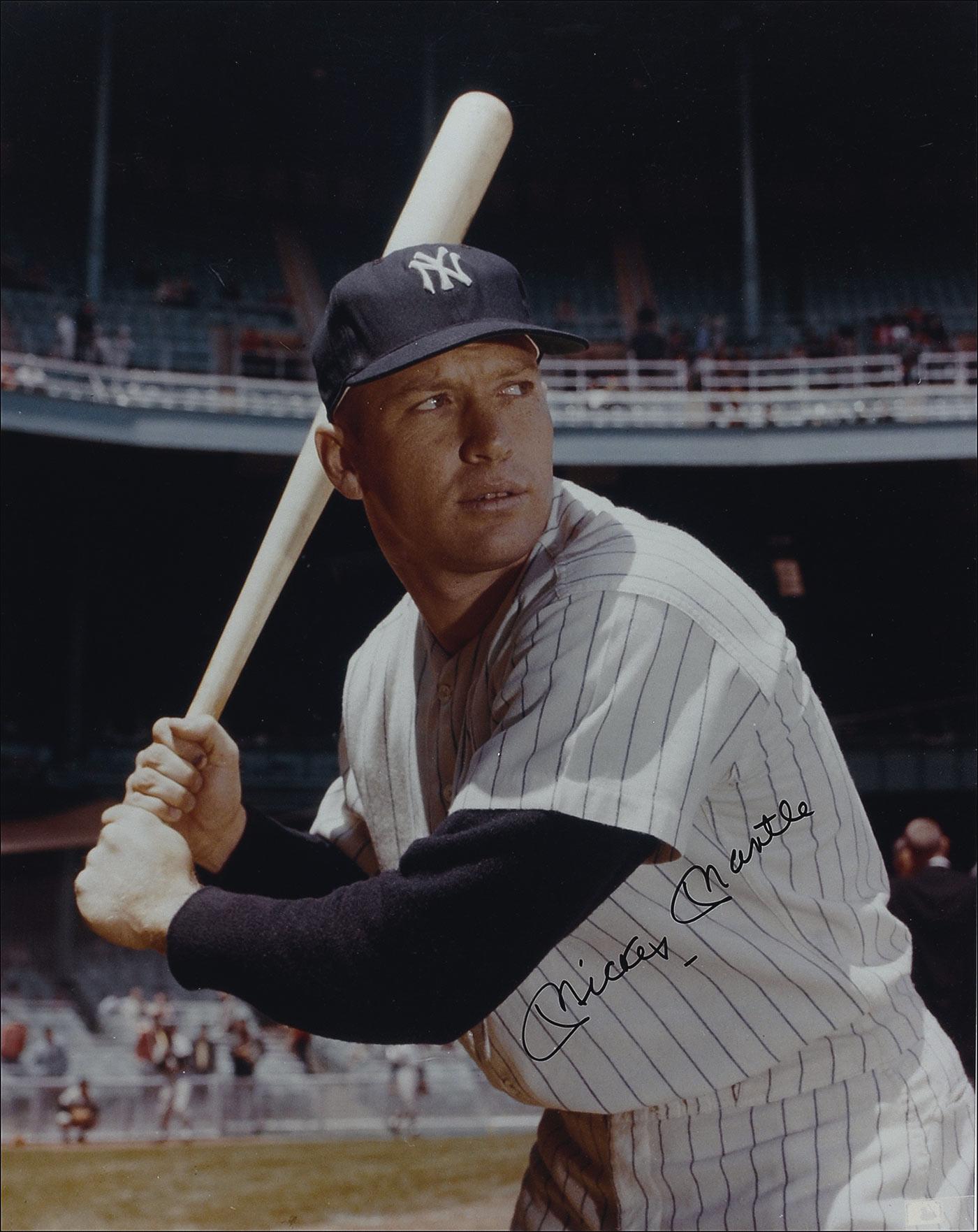 Color satin-finish 16 x 20 photo of Mantle in his batting stance at Yankee Stadium, signed in black felt tip. In fine condition. Pre-certified Steve Grad/PSA/DNA and RRAuction COA.