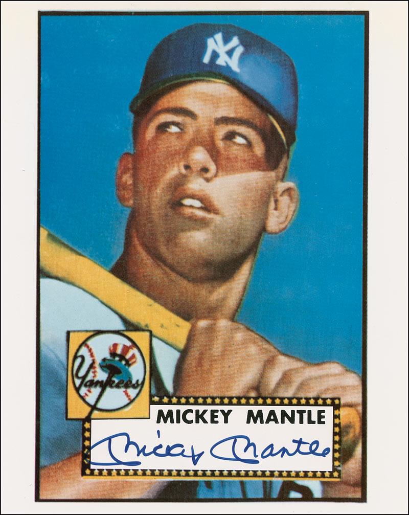 Color 8 x 10 cardstock photo reprint of Mantle’s 1952 trading card, signed in blue felt tip. In fine condition, with a few light surface marks and bends. Pre-certified Steve Grad/PSA/DNA and RRAuction COA.