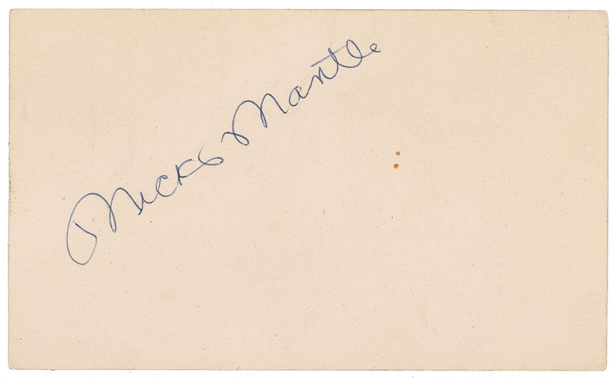 Vintage ballpoint signature, “Mickey Mantle,” on an off-white 5 x 3 card, with signature dating to 1954. In fine condition, with a uniform shade of mild toning and a couple of trivial spots.