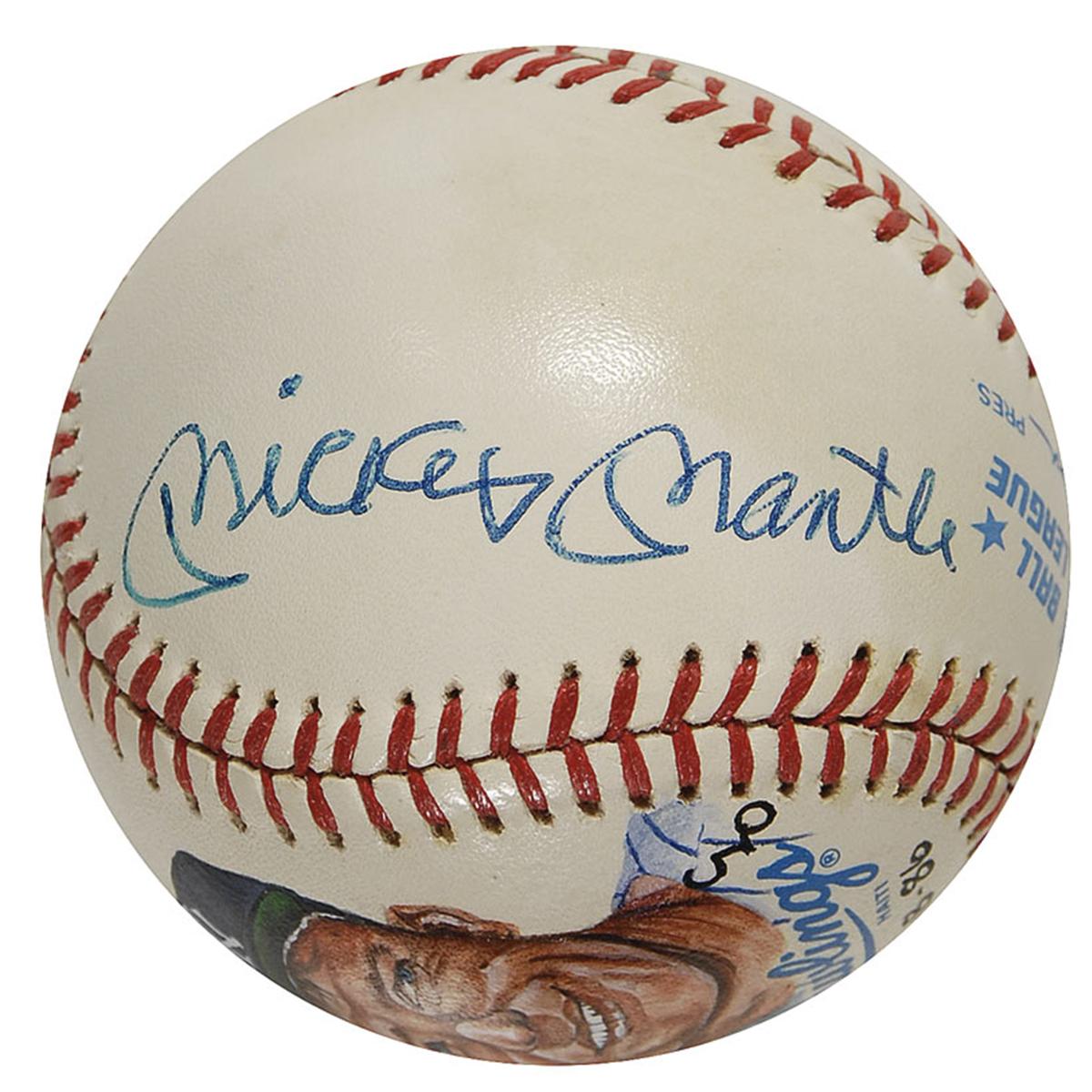 Official Rawlings American League baseball signed in blue ballpoint on a side panel by Mantle, with an original color portrait of Mantle on a second side panel, initialed by the artist, and dated September 8, 1986. In fine condition, with some scattered light toning.