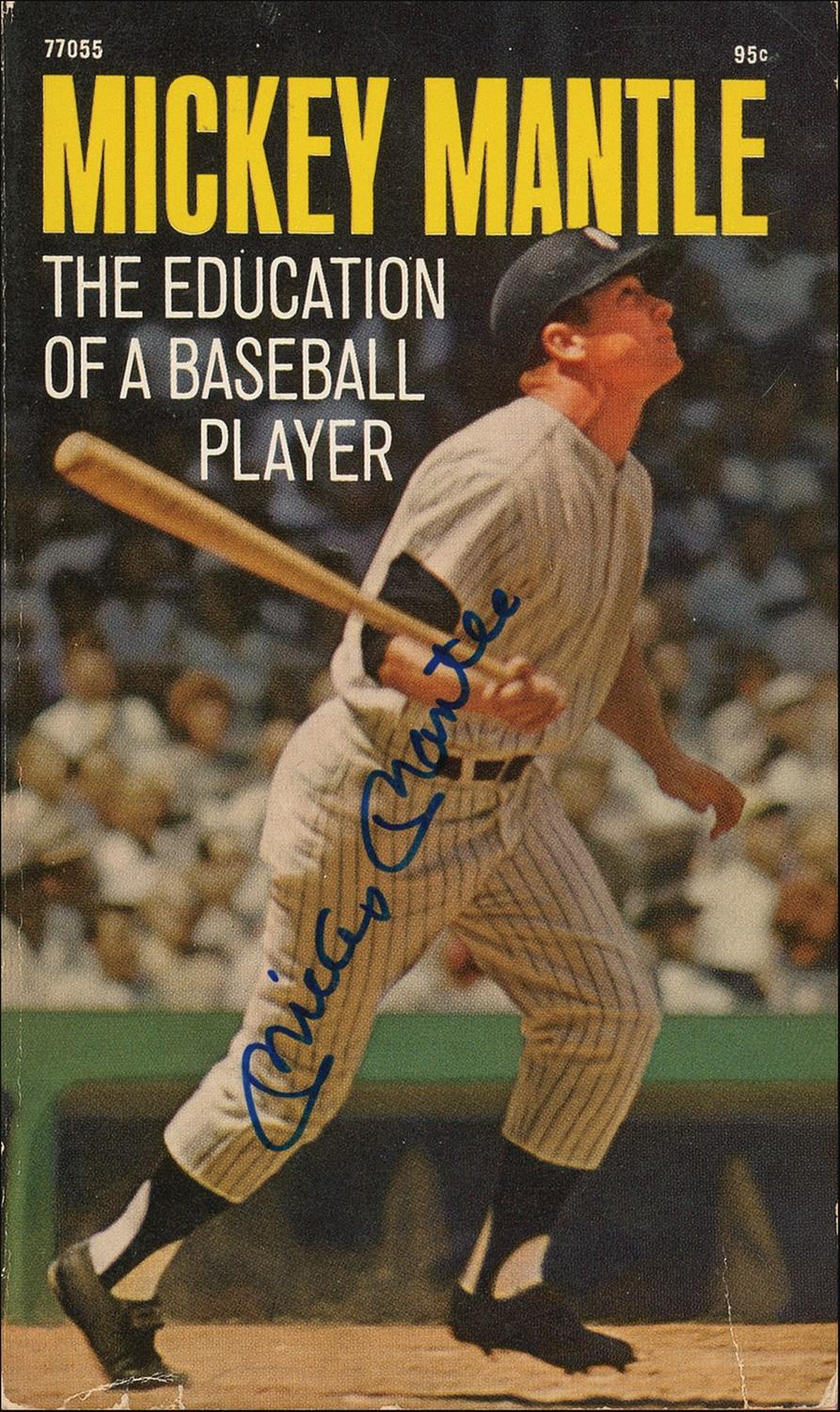 Signed book: Mickey Mantle: The Education of a Baseball Player. Later printing. NY: Pocket Books, 1969. Softcover, 4.25 x 7, 182 pages. Signed in blue felt tip, “Mickey Mantle,” on the cover. In fine condition, with light surface creases and marks, one blemish touching the bottom first letter of “Mantle,” and mild creasing to the spine.