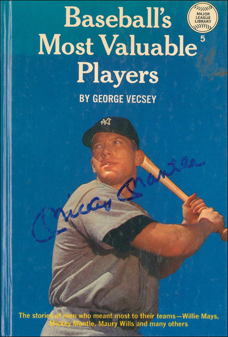 Signed book: Baseball’s Most Valuable Players by George Vecsey. Later printing. NY: Random House, 1966. Hardcover, 5.75 x 8.5, 186 pages. Signed in blue felt tip on the front cover, “Mickey Mantle.” In fine condition, with few faint scratches and soiling on the front cover and a few spots of lighter ink adhesion of the signature.