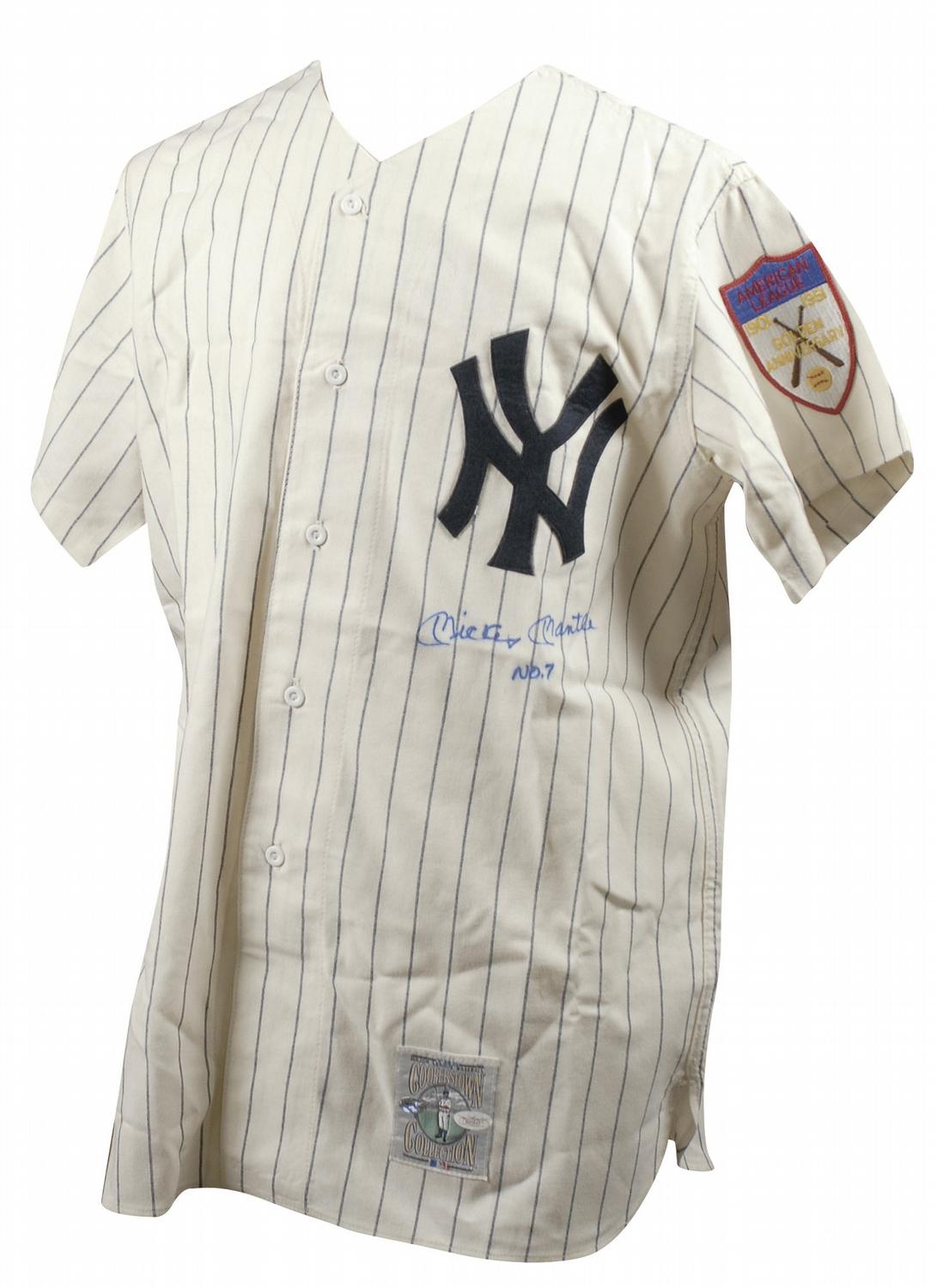 Official Mitchell & Ness Cooperstown Collection New York Yankees baseball jersey, with sewn on letters and numbers, signed in blue felt tip on the front, “Mickey Mantle No. 7.” In very fine condition with a James Spence Authentication label affixed to the tail. Accompanied by a full LOA from James Spence.