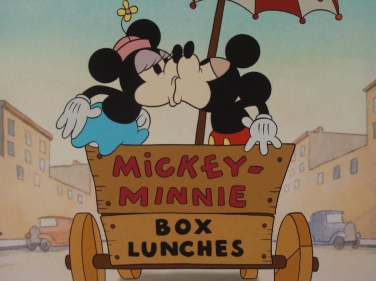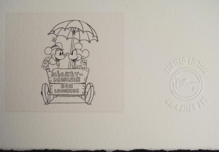 Here is a Limited Edition animation art print from Walt Disney's animated short, Building a Building (1933), Scene 74. This print features Mickey Mouse and Minnie Mouse in a lunch cart kissing under an umbrella, enjoying their romantic ride. In the lower margin are five image of animation drawings. This is a wonderful, heartfelt piece! * Title: "Building a Romance - Studio Edition" Medium: Giclée on paper Date of Publication: 2004 Edition: From a Limited Edition of 500, marked lower left Certification: Embossed with Walt Disney Animation Art Seal, lower right Image size: 11 x 13 inches Sheet size: 18 x 17 inches Condition: Excellent Certificate of Authenticity: Included