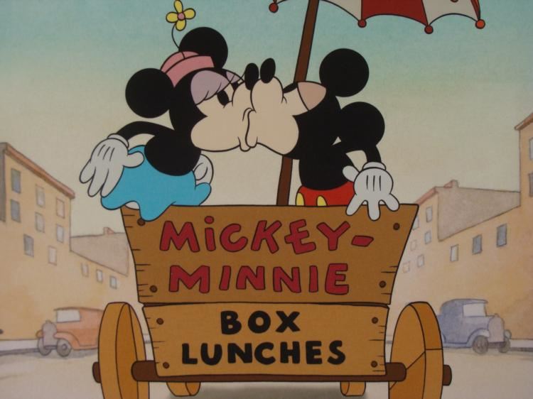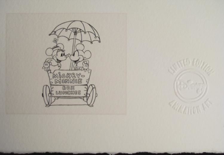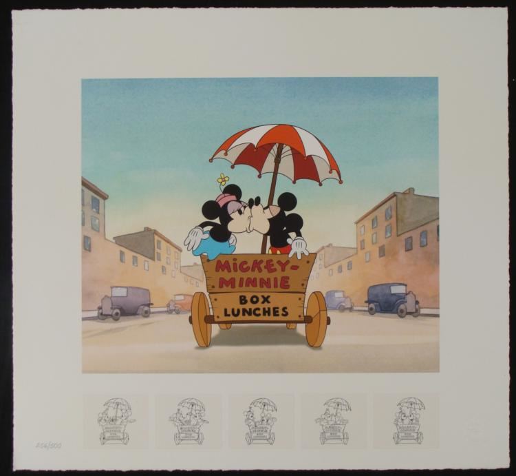 Here is a Limited Edition animation art print from Walt Disney's animated short, Building a Building (1933), Scene 74. This print features Mickey Mouse and Minnie Mouse in a lunch cart kissing under an umbrella, enjoying their romantic ride. In the lower margin are five image of animation drawings. This is a wonderful, heartfelt piece! Title: "Building a Romance - Studio Edition" Medium: Giclée on paper Date of Publication: 2004 Edition: From a Limited Edition of 500, marked lower left Certification: Embossed with Walt Disney Animation Art Seal, lower right Image size: 11 x 13 inches Sheet size: 18 x 17 inches Condition: Excellent Certificate of Authenticity: Included