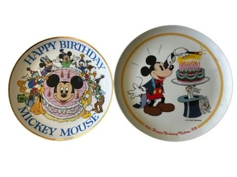 This is a special edition collectors plate that commemorates the 50th birthday of Mickey Mouse. Mickey Mouse made his screen debut November 18, 1928 as a star of steamboat Willy, the first sound cartoon. Since then Mikki has become an international personality with over 118 films to his credit. For decorative purposes only. Made by the Walt Disney productions company. The second collectors plate is a 1928 happy birthday Mickey 1978 plate. Made by tensile film. Labeled happy birthday Mikki 1928 to 1978 this is a limited edition collectors plate numbered 8127 out of 15,000. From Schmid the creative hand company. Approx 7”x5”.