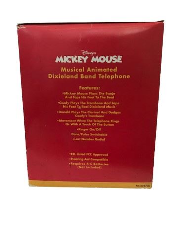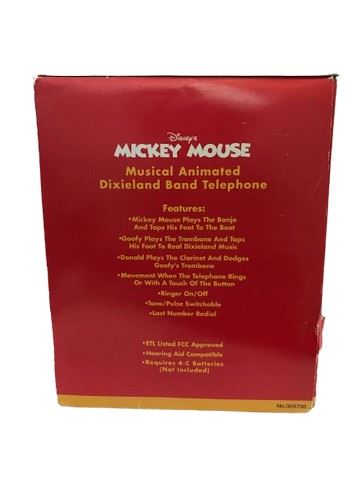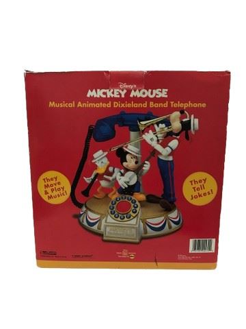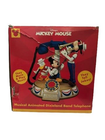 Disney's Mickey Mouse musical, animated Dixieland Band telephone. New in the box. Box has a rip in the back and has separated from the side along the seam.