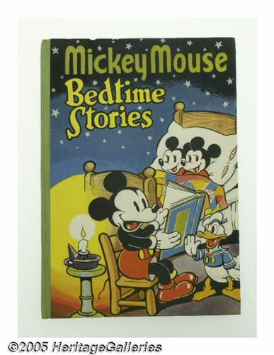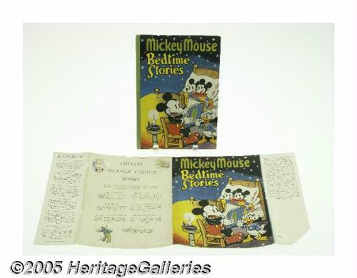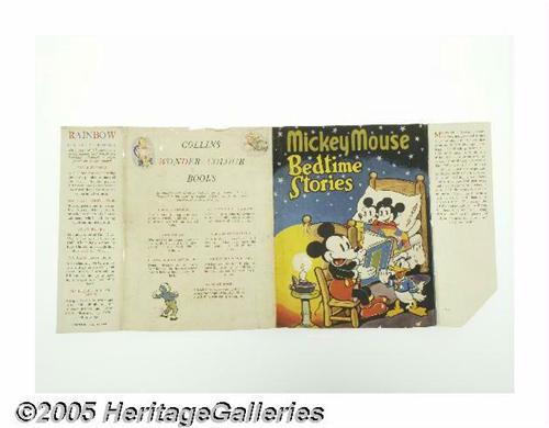 <B>Mickey Mouse Bedtime Stories with Dust Jacket (The Sunshine Press, circa 1940).</B></I> The quality of this 7" x 9.25" hardcover <B>Mickey Mouse Bedtime Stories</B></I>, printed in Great Britain by The Sunshine Press, is absolutely superb. Its 96 pages feature both black and white and glorious full color illustrations, many of which are full page. The story titles are "The Three Golden Keys," "The City Under The Oak," and "The Giant's Castle". While the cover does have some minimal edge wear, and very light chipping, it remains bright with vibrant color. The contents are bright and quite clean, with very little aging apparent. A stunning early Mickey book in extremely Excellent condition! Book and dust jacket both grade Near Mint. <I>From the Larry Jacobs Collection.</B></I>