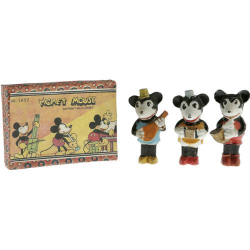 <B>Mickey Mouse Bisque Musician Set in Box (Walt Disney, circa 1930).</B></I> This three bisque set was manufactured in Japan. The 3.5" tall figures are hand-painted. Box has some discoloration on one side, otherwise in Excellent condition. The bisque figures are also in Excellent condition.<BR><BR><b>Shipping:</b> Miscellaneous Collectibles, Smal (<a target="_blank" href="http://www.heritageauctions.com/common/shipping.php">view shipping information</a>)