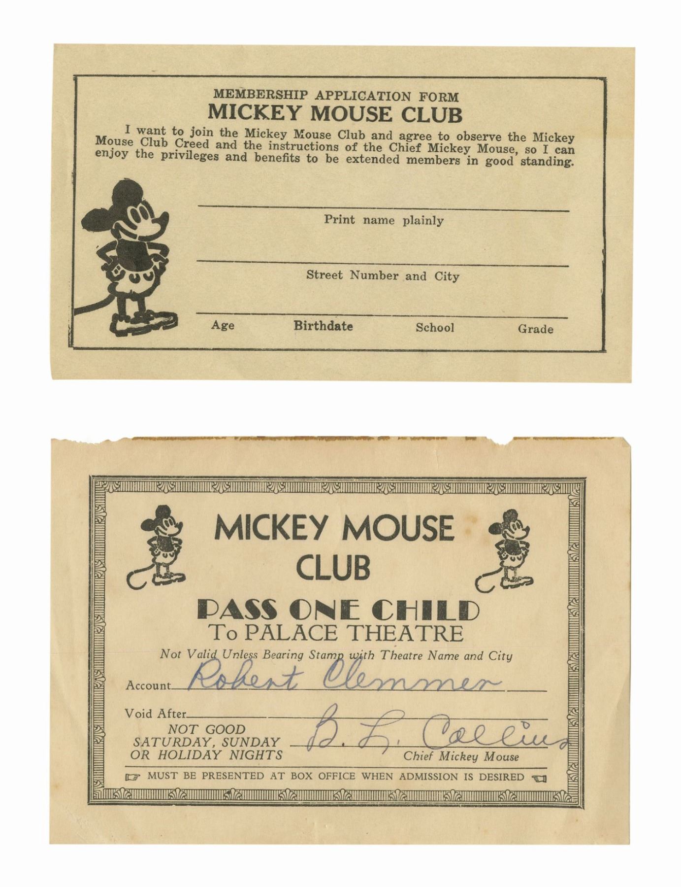 (Disney, c.1930s) A Mickey Mouse Club application form and a child pass to the Palace Theater that is signed by the club's "Chief Mickey Mouse." The application measures 3"x5.25" and the pass measures 3.75"x5.25". Both are in good condition with minimal edge-wear. The pass has some discoloration along the top edge from where it was attached to a pad, a spot of discoloration at the lower left and next to the word "Mouse," and three pin holes at the bottom center. There is also some bending along the edges.