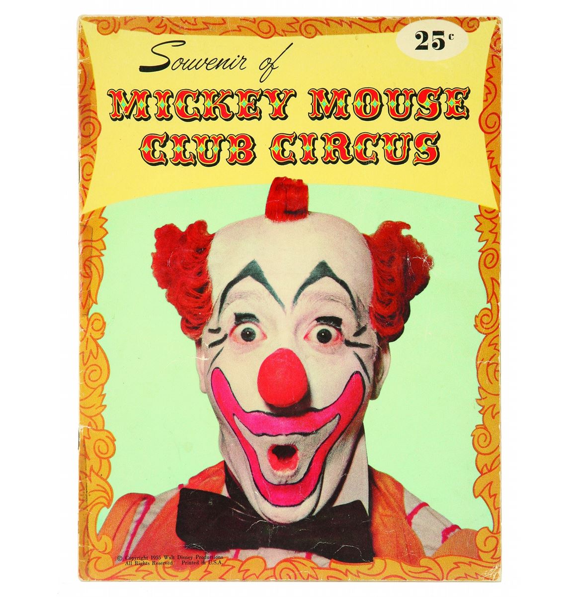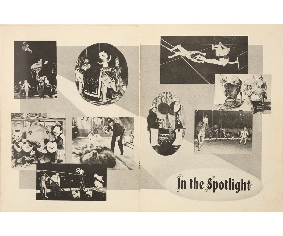 (Disneyland, 1955) Souvenir program for one of the shortest-lived attractions ever to be presented in the park. This rare, photo-filled program was sold to the few guests that visited the striped circus tent near Holiday Hill (present day location of the Matterhorn). The Program is 12 pages and measures 12”x9”. In good condition with tape and light creasing on the cover and pages. The center pages have come loose from the staples.