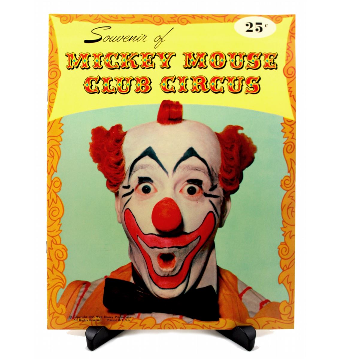 (Disneyland, 1955) Souvenir program for one of the most short-lived attractions ever to be presented at the park. Walt wanted to present an old fashioned traveling circus at the foot of Main Street and added the stars of the Mickey Mouse Club as an added attraction. However, to 1955 visitors, a circus was old hat…Disneyland was what they came for. With low attendance and numerous operational problems including an escaped Camel running down Main Street, the attraction closed in 1956. This rare, photo-filled program was sold to the few guests that visited the striped circus tent near Holiday Hill (present-day location of The Matterhorn). Measuring 12 x 9 in. and in very good condition.