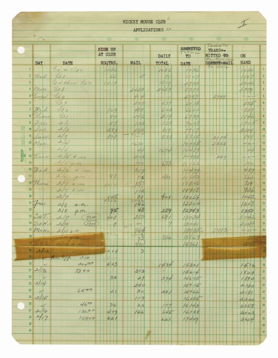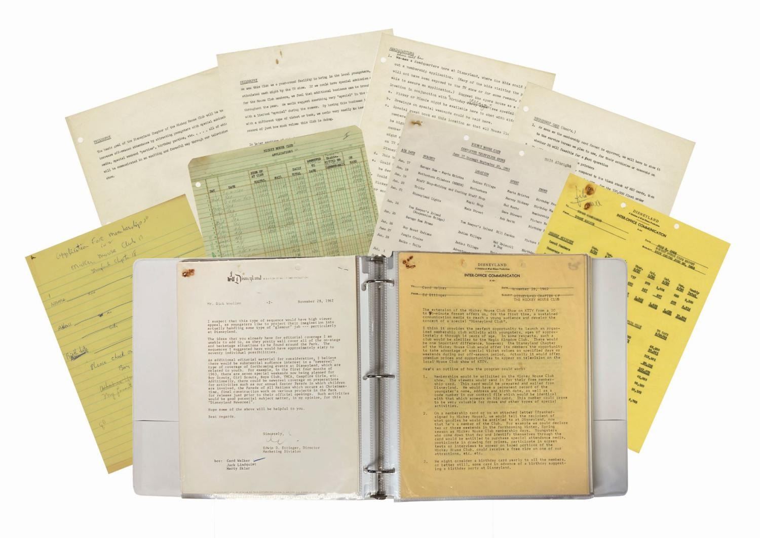 (Disneyland, 1962-64) An incredible archive of documents relating to the creation and operation of the Disneyland Headquarters of the Mickey Mouse Club. The Mickey Mouse Club Headquarters was a park attraction from 1963 to 1964 and was housed within the Main Street Opera House. At the Headquarters, children could sign up for membership to the Mickey Mouse Club, meet costumed characters, and obtain special membership cards and badges. The Headquarters was strongly cross-promoted through segments on the Mickey Mouse Club television show, which hoped to increase park-attendance. This incredible archive contains documents and inter-office communication from the earliest planning of the Headquarters to its opening in January of 1963, to operational data from its final year in 1964. These documents were created, sent, and received by some of Disneyland's biggest names of the 1960s including Milt Albright, Donn Tatum, Card Walker, Ed Ettinger, Tommy Walker, and Dick Nunis, among others. Some of the highlights of this collection include typed documents with hand-written notes relating to the original planning of the Headquarters, including the suggestion that the Headquarters should be contained within the Opera House. Also included is operational data from the opening of the Headquarters, such as the number of membership applications filed, the number of member badges distributed, the costs of operation including a re-do of the interior of the Opera House, and much more. A hand-written concept for the membership application is included, as well as two copied samples of designs for the membership cards. There are over 150 pages of documentation in this incredible archive, which spans the entire history of the Disneyland attraction. The documents range slightly in size, with most pages measuring 11"x8.5". The pages were later transferred to document sleeves within a 3-ring binder for their protection and continued preservation. The archive is in very good condition with discoloration where staples or paperclips have caused some browning to some of the sheets, as well as some creases, folds, or other expected handling wear from use. This is the only such archive we have ever seen for this short-lived park landmark and provides a fascinating look into its creation and opening.