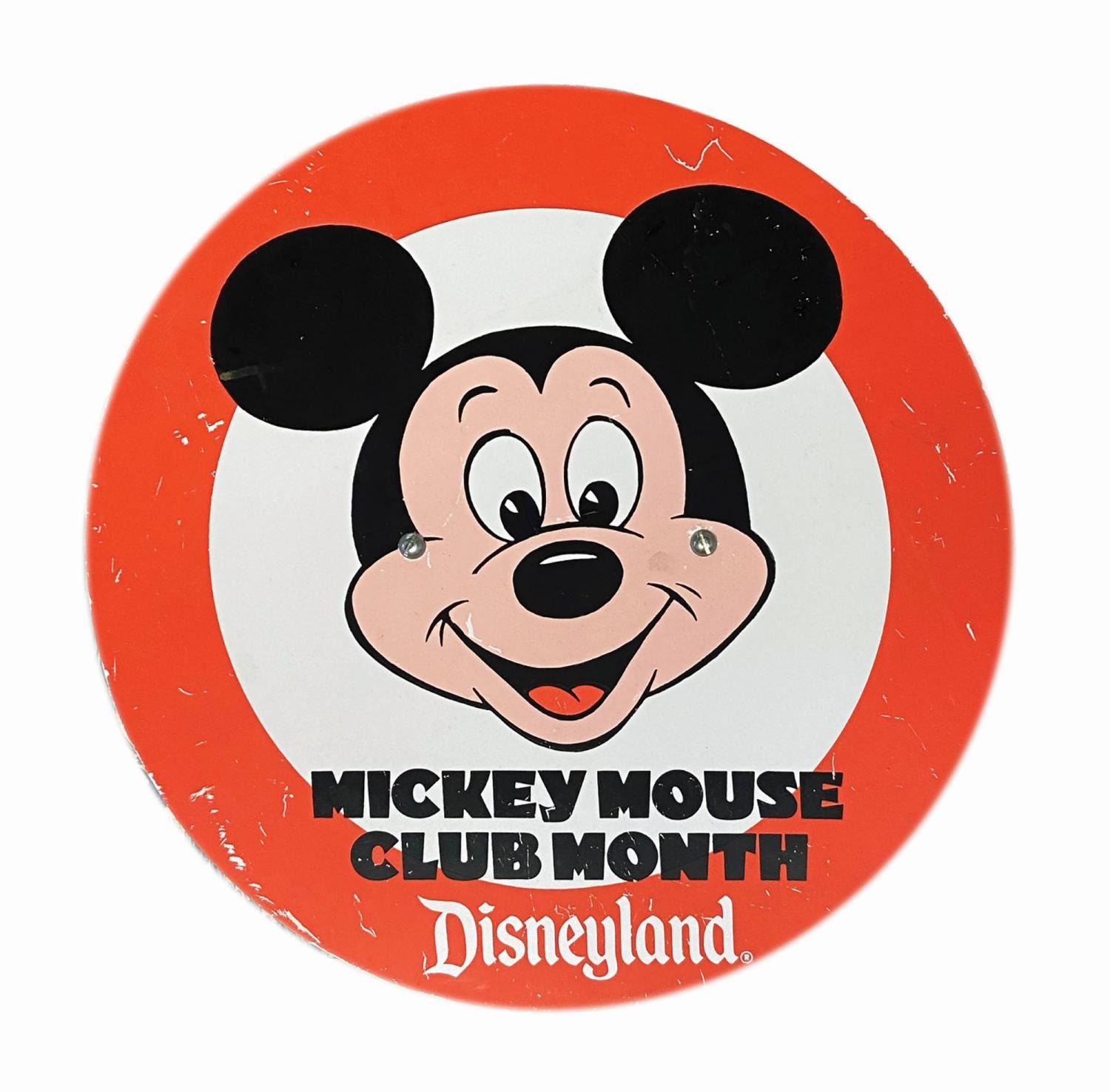 (Disneyland, 1985) A plaque used to decorate Disneyland during the Mickey Mouse Club Month celebration. Featuring the Mickey Mouse Club logo with the alternate text of "Mickey Mouse Club Month," the plaque has two screws for mounting on the reverse. Measuring 15.75" in diameter, the sign is in fair condition with scratching to the paint throughout from use. Some of the paint loss to Mickey's ears and eyes has been repaired with black ink. Included is the original Certificate of Authenticity from the Disneyana Shop at Disneyland.