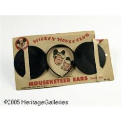 <B>Mickey Mouse Club Mouseketeer Ears (Walt Disney Productions, circa 1950s).</B></I> Straight from the Mickey Mouse Club -- what every Mouseketeer wants and needs -- Mickey Mouse Club Mouseketeer Ears! Produced by Kohner Bros., these snap-on Ears are registered as No. 303, made from black plastic, and mounted in a 6.75" x 12.25" cardboard backing. The Ears are in Very Good condition. The backing board shows some edge wear and tearing, otherwise it is in Good condition.