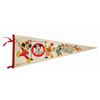 (Disneyland, c.1970s) A vintage Mickey Mouse Club souvenir pennant from Disneyland. The felt pennant features printed graphics of drum major Mickey Mouse leading a procession of beloved Disney characters. The left edge is reinforced with a strip of red felt and ornamental streamers. Measuring 11.75"x 28.25", the pennant is in very good condition with tack holes to the left edge, wrinkling towards the tip, and multiple pin and tack holes to the right tip.