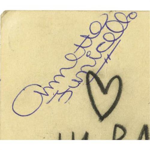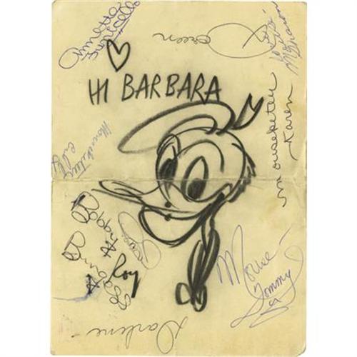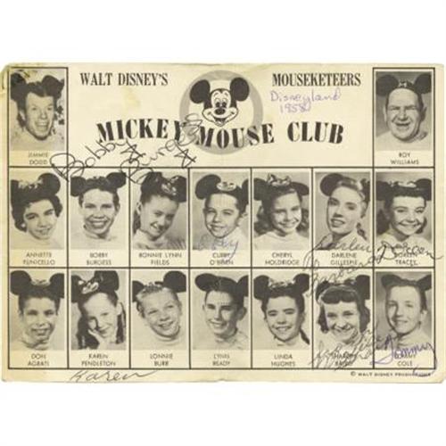 <B>Mickey Mouse Club Signed Roster.</B></I> Charter members of the Mickey Mouse Club rejoice, this vintage Mouseketeer roster card, signed in 1958, boasts the signatures of Annette Funicello, Cubby O'Brien, Bobby Burgess, Doreen Tracey, Sharon Baird, Karen Pendleton, Tommy Cole, Darlene Gillespie, and the "Big Mooseketeer" Roy Williams (along with Roy's sketch of Donald Duck en verso). Airing five days a week, running a total of 360 episodes, the series was cancelled in 1959, a year after this card was signed. Also included is a reproduced photo from the signing event at Disneyland. In Very Fine condition with minor staining to upper left corner, moderate age-toning, and a center crease to the roster card. <I>Accompanied by LOA from PSA/DNA.</B></I><BR><BR><b>Shipping:</b> Flat Material, Small (<a target="_blank" href="http://www.heritageauctions.com/common/shipping.php">view shipping information</a>)