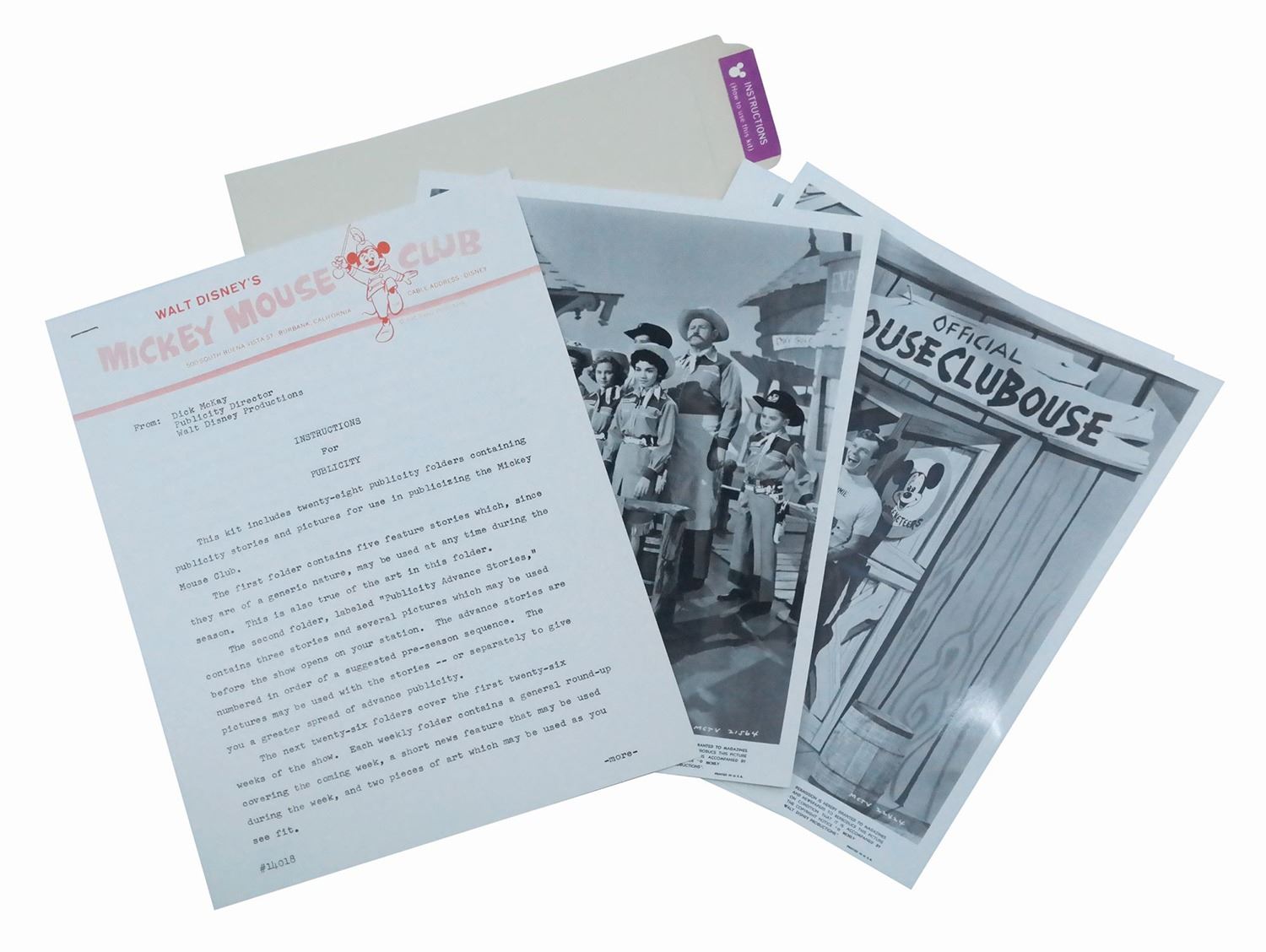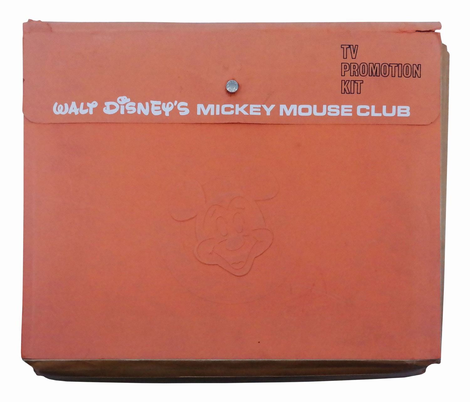 (Disney, 1956) A rare Mickey Mouse Club promotional kit for the show's second season. The kit includes both pre-season and weekly seasonal press releases for 26 weeks of the show's second season. Intended for use by television stations, the kit includes over 40 publicity photos to be used as the station sees fit. The materials are contained in a folio with an embossed image of Mickey Mouse on the front. Measuring 10"x13" and 2" deep, the kit is in very good condition overall with some wear from use and age. The outer folio itself is in fair condition, with tearing along the top hinge and at the bottom corners.